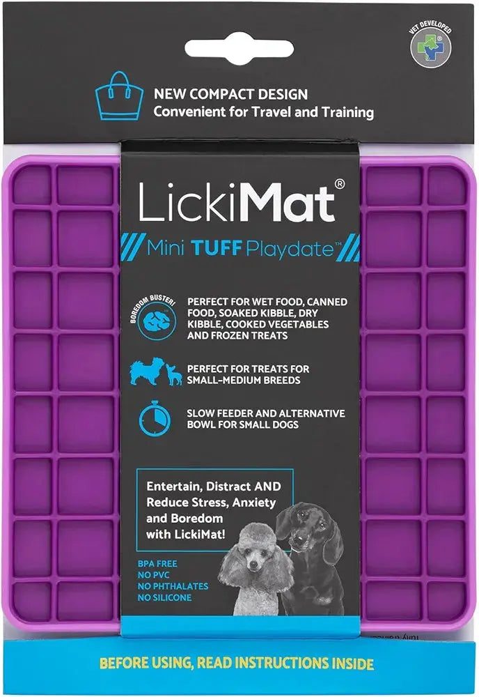 The LickiMat® Mini Playdate™ is particularly effective for raw feeding and can be used with various treats such as fruit and pureed vegetables. Its unique design encourages slow feeding, making it an ideal slow feeder for small to medium-sized dogs.